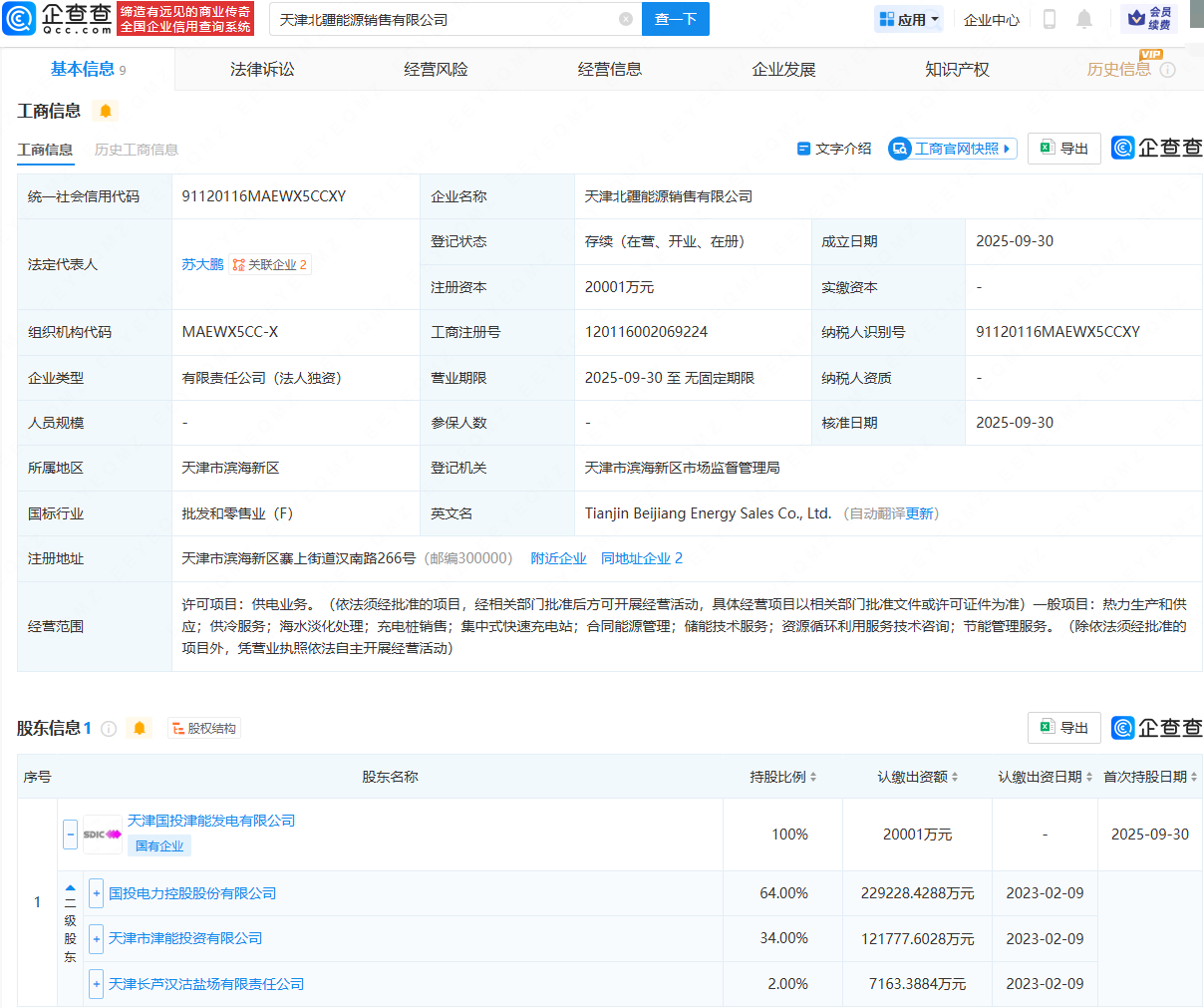 近日,天津北疆能源销售有限公司成立,法定代表人为苏大鹏,注册资本约为2亿元炒股网站,经营范围包含:供电业务;热力生产和供应;供冷服务;海水淡化处理;充电桩销售;集中式快速充电站等。企查查股权穿透显示,该公司由国投电力(600886)旗下天津国投津能发电有限公司全资持股。